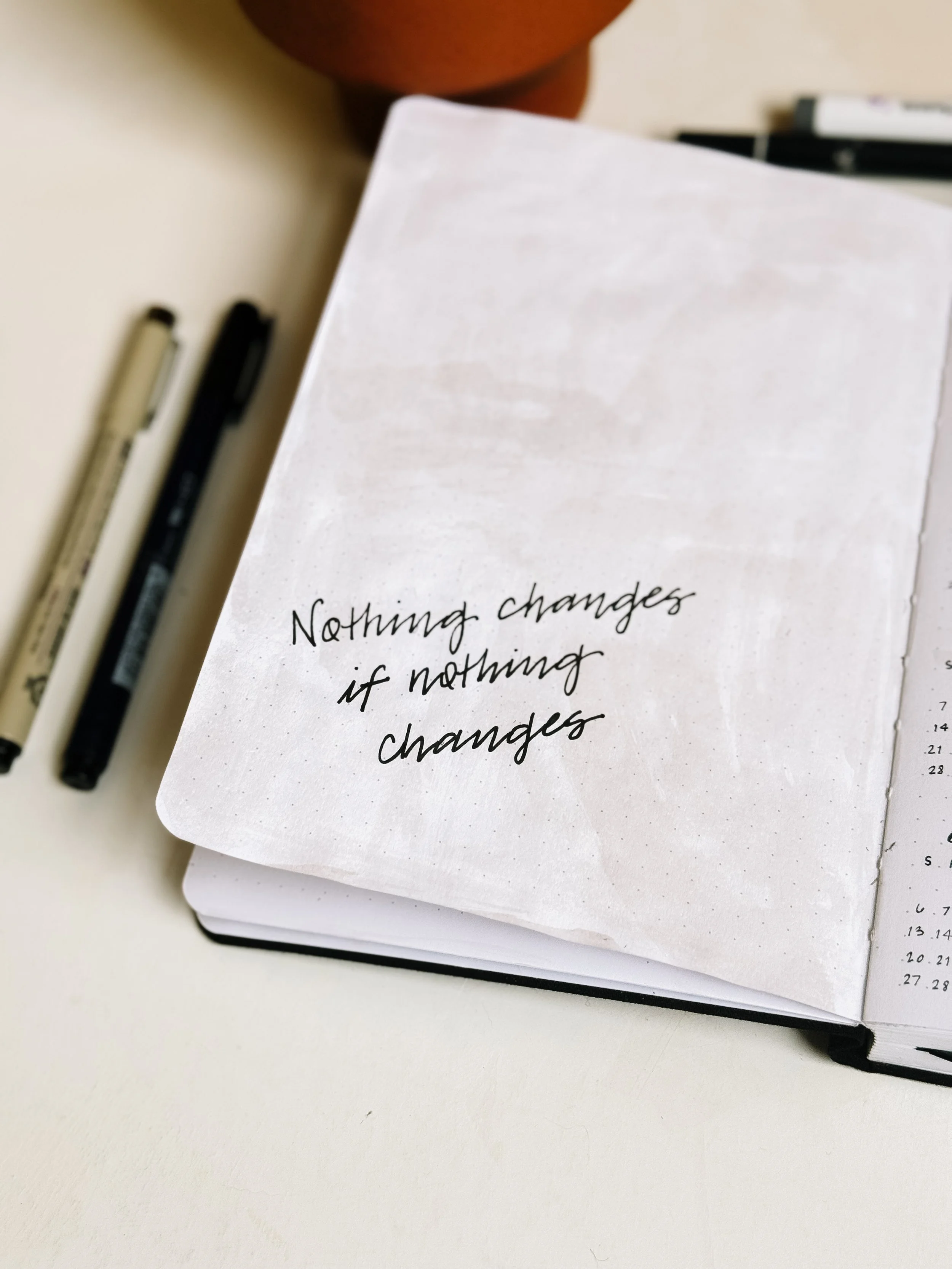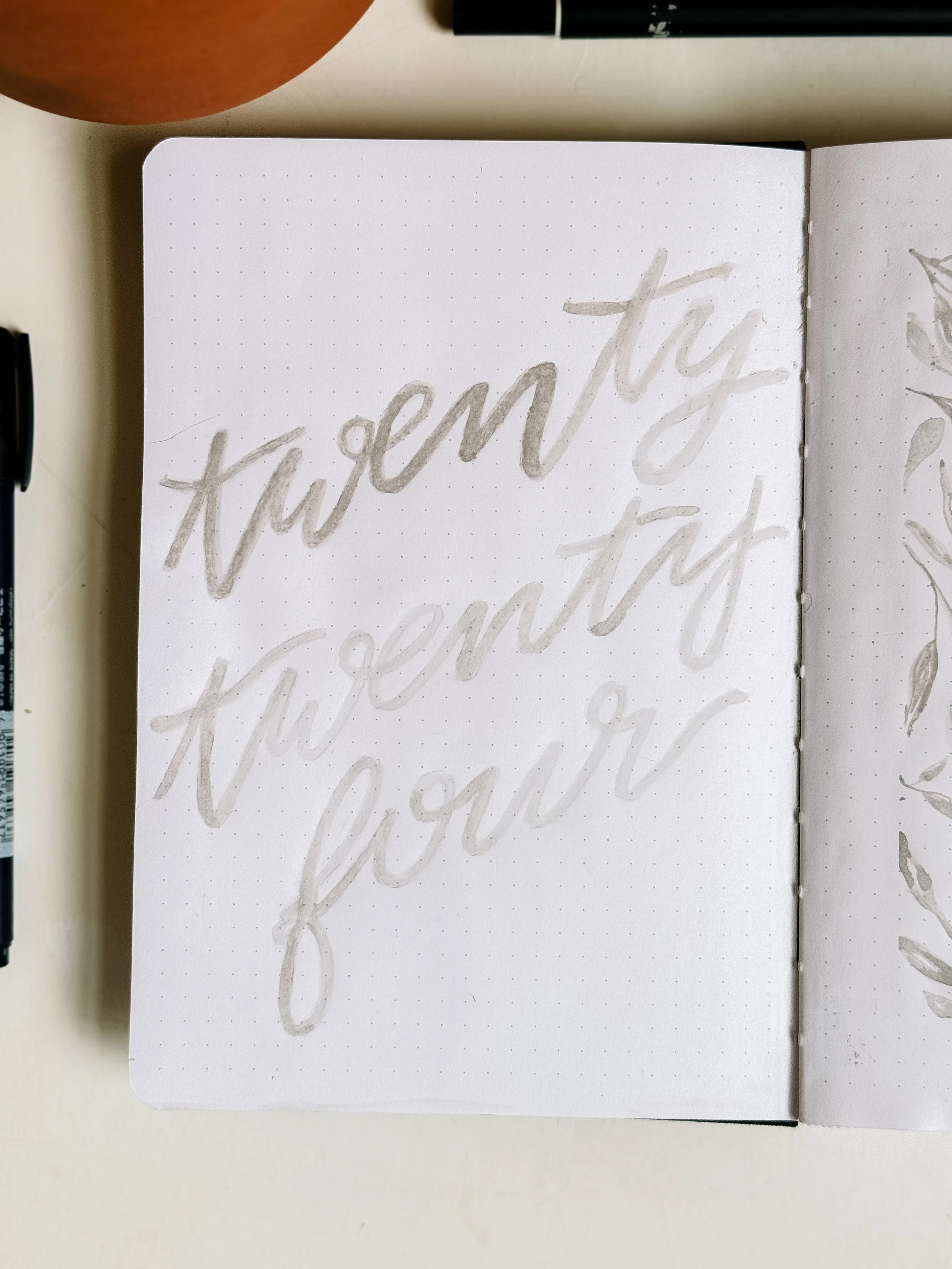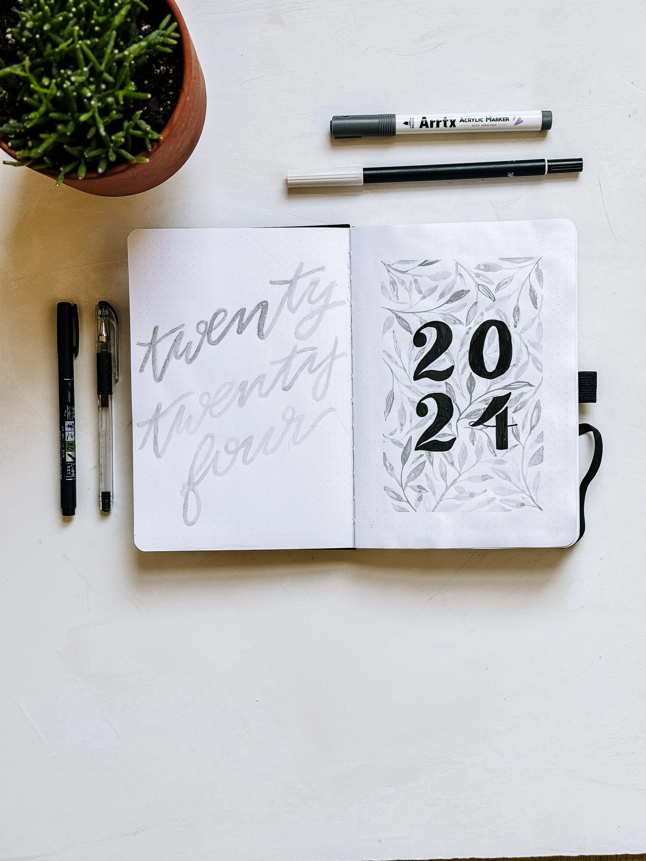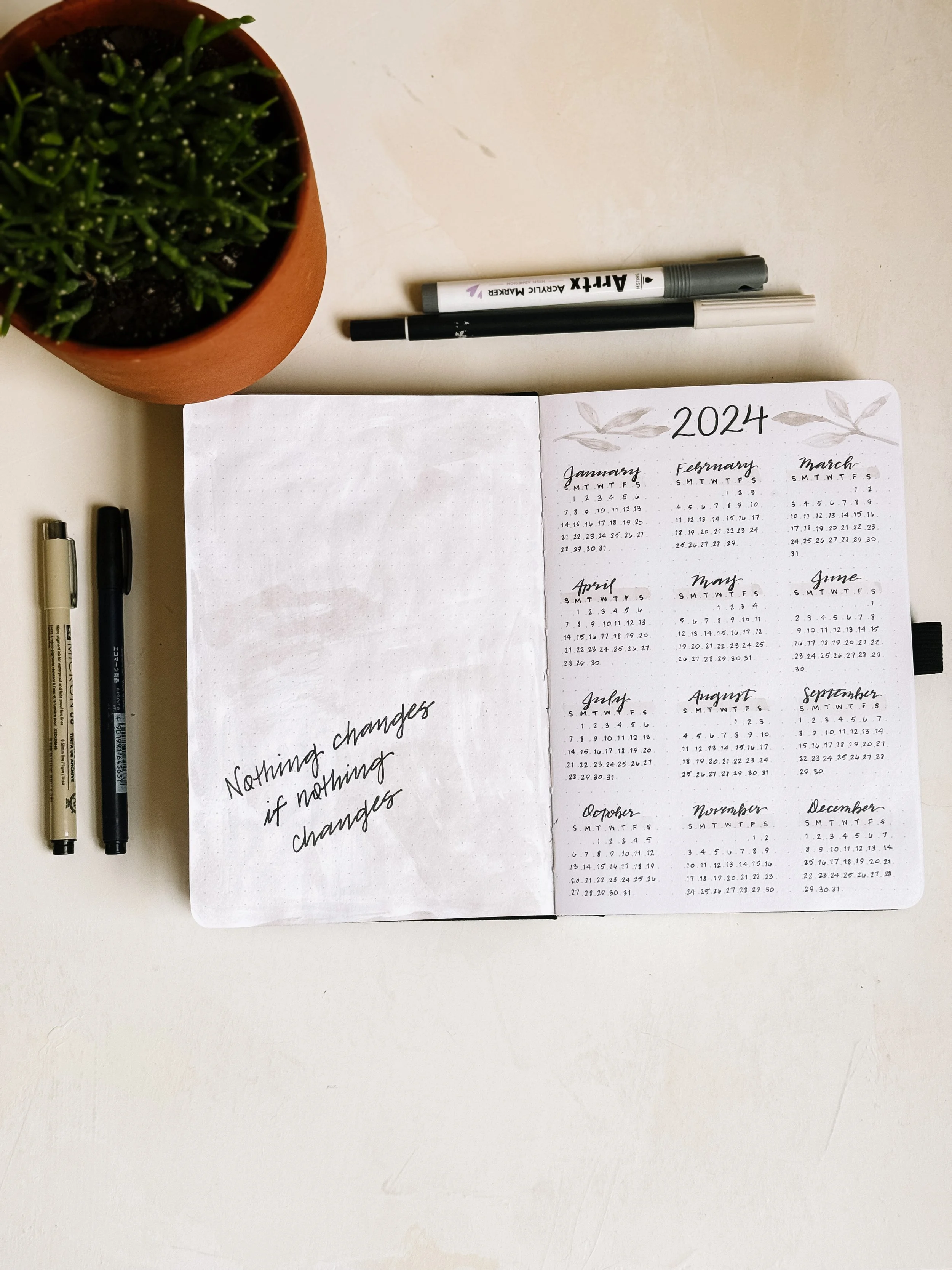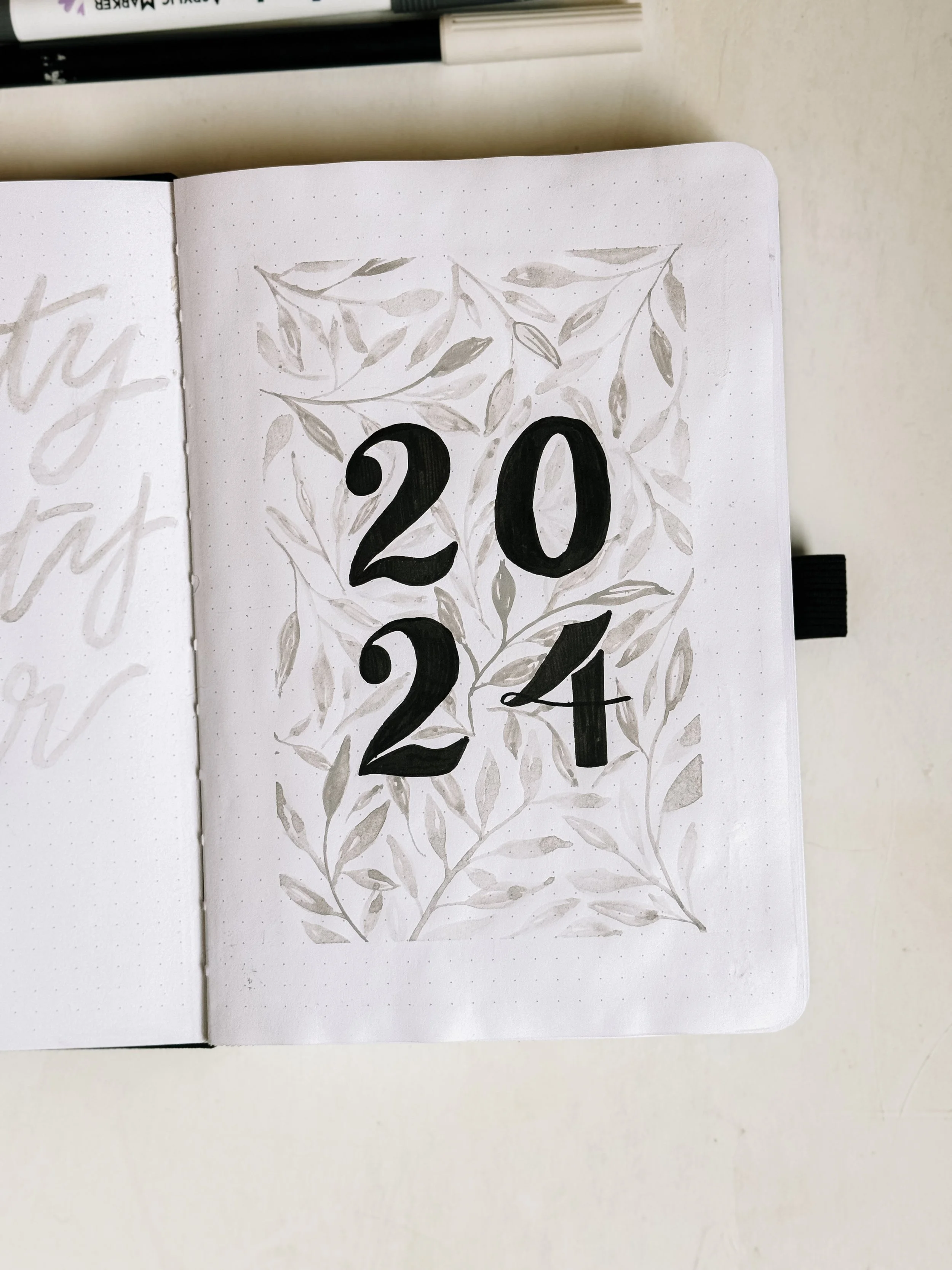 To get some content started, here’s a look back at my 2024 bullet journal yearly setup. I try to keep my early pages more minimal in design so that I don’t get sick of it halfway through the year. These show my title page and year at a glance, but I’ll show my entire setup for my 2025 notebook when I get it ready!